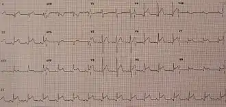 Ces anomalies sont diffuses dans toutes les dérivations et concordantes, sans image en miroir. Il existe rarement un aspect de bas voltage diffus lorsque l'épanchement est important. Il y a parfois des troubles du rythme auriculaire, fibrillation et flutter auriculaire[6].