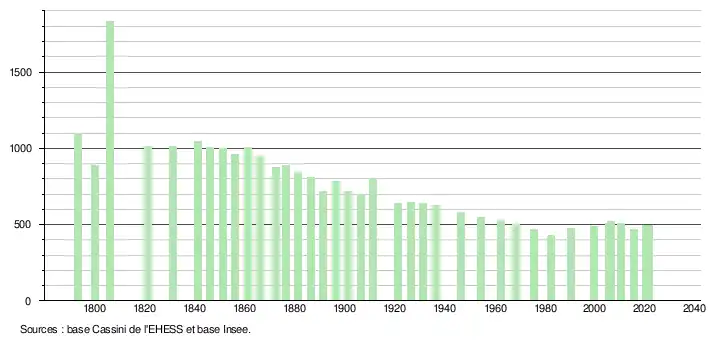 L'évolution du nombre d'habitants est connue à travers les recensements de la population effectués dans la commune depuis 1793. Pour les communes de moins de 10 000 habitants, une enquête de recensement portant sur toute la population est réalisée tous les cinq ans, les populations légales des années intermédiaires étant quant à elles estimées par interpolation ou extrapolation[32]. Pour la commune, le premier recensement exhaustif entrant dans le cadre du nouveau dispositif a été réalisé en 2005[33].