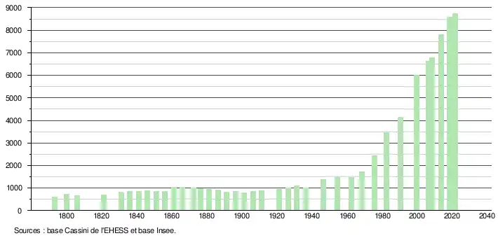 L'évolution du nombre d'habitants est connue à travers les recensements de la population effectués dans la commune depuis 1793. Pour les communes de moins de 10 000 habitants, une enquête de recensement portant sur toute la population est réalisée tous les cinq ans, les populations légales des années intermédiaires étant quant à elles estimées par interpolation ou extrapolation[20]. Pour la commune, le premier recensement exhaustif entrant dans le cadre du nouveau dispositif a été réalisé en 2008[21].