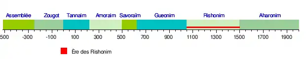 La période des Rishonim fait suite à celle des Gueonim, directeurs des grandes académies talmudiques de Babylonie et de la terre d'Israël. Le passage entre les ères, assez flou, se produit autour du XIe siècle. Nissim Gaon (999-1062), son collègue Rabbenou Hananel (990-1053) et Samuel ibn Nagrela (993-1055) sont généralement considérés comme les premiers Rishonim, c'est-à-dire les premières autorités rabbiniques relativement indépendantes du centre babylonien en matière de Loi juive. Ils ont assuré la transmission de ses enseignements après la mort de Haï Gaon, en 1038[2]. En Allemagne, le premier Rishon connu est Rabbenou Guershom (960-1028), contemporain plus âgé de Nissim Gaon et Rabbenou Hananel.