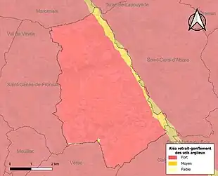 Le retrait-gonflement des sols argileux est susceptible d'engendrer des dommages importants aux bâtiments en cas d’alternance de périodes de sécheresse et de pluie. La totalité de la commune est en aléa moyen ou fort (67,4 % au niveau départemental et 48,5 % au niveau national). Sur les 524 bâtiments dénombrés sur la commune en 2019, 524 sont en aléa moyen ou fort, soit 100 %, à comparer aux 84 % au niveau départemental et 54 % au niveau national. Une cartographie de l'exposition du territoire national au retrait gonflement des sols argileux est disponible sur le site du BRGM[19],[Carte 2].