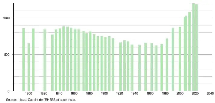 L'évolution du nombre d'habitants est connue à travers les recensements de la population effectués dans la commune depuis 1793. Pour les communes de moins de 10 000 habitants, une enquête de recensement portant sur toute la population est réalisée tous les cinq ans, les populations légales des années intermédiaires étant quant à elles estimées par interpolation ou extrapolation[21]. Pour la commune, le premier recensement exhaustif entrant dans le cadre du nouveau dispositif a été réalisé en 2007[22].