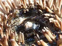Chez les oursins, le péristome correspond à la région buccale, sur la face ventrale de l'oursin. Il correspond plus exactement à l'orifice ventral de l'animal, par opposition au périprocte situé au sommet de la face dorsale et qui correspond à l'orifice anal[6].