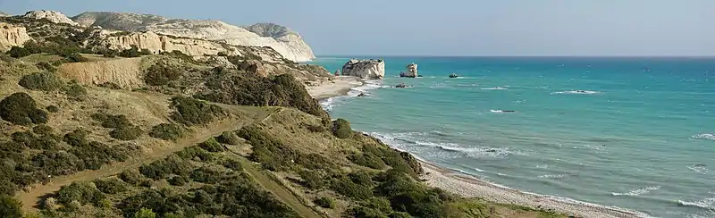 Selon une légende, ce rocher est le site de la naissance de la déesse Aphrodite, peut-être en raison de l'écume des eaux autour des fragments de roche. Il est connu pour cette raison sous le nom de Rocher d'Aphrodite. Gaia (la Terre Mère) a demandé à ses enfants de la venger d'Ouranos (le Ciel), ce que va faire l'un de ses fils, Cronos. Cronos tend une embuscade à son père[2], et le mutile avec une faux. Ouranos tente de s'échapper en s'envolant. Mais il perd des parties de son corps et les testicules tombent à la mer. Une version locale de la légende indique que le rocher d'Aphrodite correspond à la partie inférieure du corps de Cronos. Une mousse blanche apparaît à partir de laquelle une jeune fille se lève (Ἀφροδίτη, « celle qui se lève de l'écume »). La jeune fille, nommée Aphrodite, se rend à l'assemblée des dieux de Chypre. Un sanctuaire d'Aphrodite a existé dans l'ancienne Paphos, Kouklia. Son culte a été ensuite remplacé par les Romains par celui de Vénus.