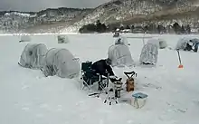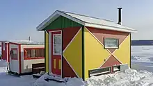 Plusieurs adeptes de la pêche sur glace installent des cabanes à pêche. Celles-ci sont généralement de petites habitations en bois de quelques mètres carrés, elles sont parfois chauffées. Pour pêcher à l'abri des intempéries, certaines cabanes à pêche possèdent une ou plusieurs ouvertures dans le plancher, cela permet pratiquer des trous dans la glace, et de pêcher.