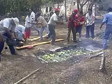 Le píib est à nouveau recouvert de terre, mais pas avant qu'une couche de feuilles sauvages soit placée sur le dessus pour garder la vapeur à l'intérieur. De nombreux types de feuilles (le) sont utilisés : jabín, pixoy (es), Guazuma ulmifolia (es), etc. L'écorce de plantain est également utilisée comme couvercle ; cependant, les feuilles de plantain ne sont pas bonnes pour les couvercles car leur cire ou leur résine est inflammable. Lorsqu'elles sont recouvertes de feuilles aromatiques, de nouvelles saveurs sont ajoutées aux aliments. La quantité de "le" dépendra également de la saison de l'année : en saison des pluies, on utilisera plus de bois de chauffage mais moins de couverture, et en saison sèche, ce sera l'inverse ; plus il y a de feuilles, plus il y a de vapeur. Les jours de pluie, il est impératif de préparer le píib la veille, afin de sécher le sol.