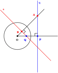 - La polaire d'un point P par rapport à un cercle de centre O et de rayon R est une droite perpendiculaire à OP, passant par H situé sur la demi-droite OP tel que OP.OH = R2.