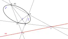 Soit x et y deux points du plan. Si yTCx = 0, on dit que les points sont conjugués par rapport à C. On déduit des formules précédentes que y appartient à la polaire de x, et x appartient à la polaire de y. De même (figure ci-contre), les polaires de tous les points d'une droite passent par le pôle de cette droite. C'est cette propriété qui montre que la transformation par polaires réciproques est une involution[2].