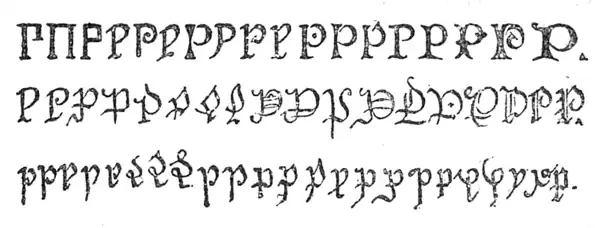 Formes majuscules et minuscules manuscrites de la lettre P dans le Dictionnaire des abréviations latines et française d’Alphonse Chassant.