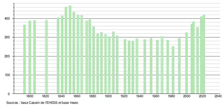 L'évolution du nombre d'habitants est connue à travers les recensements de la population effectués dans la commune depuis 1793. Pour les communes de moins de 10 000 habitants, une enquête de recensement portant sur toute la population est réalisée tous les cinq ans, les populations légales des années intermédiaires étant quant à elles estimées par interpolation ou extrapolation[18]. Pour la commune, le premier recensement exhaustif entrant dans le cadre du nouveau dispositif a été réalisé en 2008[19].