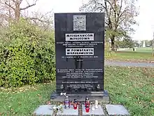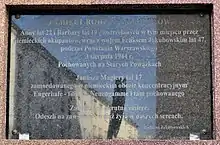 D’autres 98 insurgés, capturés après la sortie des canaux, ont été fusillés dans la rue Chocimska[72]. Avant l’exécution, les Allemands ont torturé les prisonniers en les forҫant à s’agenouiller avec les mains levées et en les frappant avec les crosses des fusils[73].