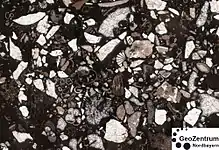 Un packstone : structure à grains contenant des petits grains (la largeur de l'image est de 7 mm).