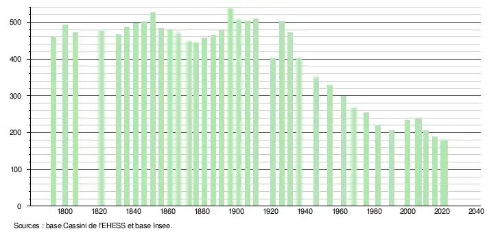L'évolution du nombre d'habitants est connue à travers les recensements de la population effectués dans la commune depuis 1793. Pour les communes de moins de 10 000 habitants, une enquête de recensement portant sur toute la population est réalisée tous les cinq ans, les populations légales des années intermédiaires étant quant à elles estimées par interpolation ou extrapolation[17]. Pour la commune, le premier recensement exhaustif entrant dans le cadre du nouveau dispositif a été réalisé en 2005[18].