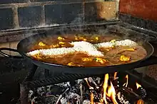 La paella ([pa.e.la] ou [pa.e.ja], mot valencien signifiant « poêle (à frire) »[1],[2]) est une spécialité culinaire traditionnelle espagnole à base de riz rond (riz bomba), originaire de la région de Valence, qui tient son nom de la poêle qui sert à la cuisiner. Elle est à ce jour un des plats emblématiques traditionnels et populaire en particulier dans sa région d'origine, ainsi que de la cuisine espagnole en général, connue dans le monde entier, et déclinée en de nombreuses variantes selon les régions.