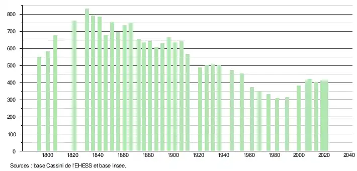 L'évolution du nombre d'habitants est connue à travers les recensements de la population effectués dans la commune depuis 1793. Pour les communes de moins de 10 000 habitants, une enquête de recensement portant sur toute la population est réalisée tous les cinq ans, les populations légales des années intermédiaires étant quant à elles estimées par interpolation ou extrapolation[14]. Pour la commune, le premier recensement exhaustif entrant dans le cadre du nouveau dispositif a été réalisé en 2008[15].