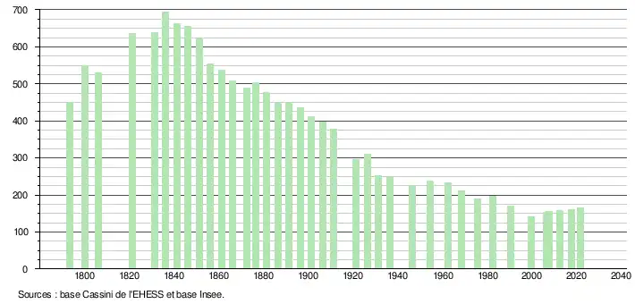 L'évolution du nombre d'habitants est connue à travers les recensements de la population effectués dans la commune depuis 1793. Pour les communes de moins de 10 000 habitants, une enquête de recensement portant sur toute la population est réalisée tous les cinq ans, les populations légales des années intermédiaires étant quant à elles estimées par interpolation ou extrapolation[13]. Pour la commune, le premier recensement exhaustif entrant dans le cadre du nouveau dispositif a été réalisé en 2007[14].