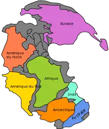 Carte de la Pangée, exemple d'un paléocontinent, avec les continents d'aujourd'hui.