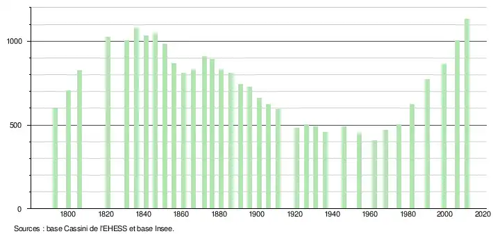 L'évolution du nombre d'habitants est connue à travers les recensements de la population effectués dans la commune depuis 1793. À partir du , les populations légales des communes sont publiées annuellement dans le cadre d'un recensement qui repose désormais sur une collecte d'information annuelle, concernant successivement tous les territoires communaux au cours d'une période de cinq ans. Pour les communes de moins de 10 000 habitants, une enquête de recensement portant sur toute la population est réalisée tous les cinq ans, les populations légales des années intermédiaires étant quant à elles estimées par interpolation ou extrapolation[4]. Pour la commune, le premier recensement exhaustif entrant dans le cadre du nouveau dispositif a été réalisé en 2006[5],[Note 2].