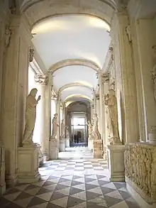 Entre le XVIe et le XVIIe siècle, les collections d'antiquités romaines s'enrichissent progressivement grâce à la découverte de nouveaux chefs-d'œuvre ; les zones semi-extérieures des palais deviennent les lieux d'exposition privilégiés des grandes sculptures antiques qui s'entassent dans les atriums et les cours. Niches, colonnes, piliers et pilastres, et sur les étagères à différentes hauteurs, reliefs, bustes et têtes antiques, le goût de la scénographie se manifeste sous ses meilleures formes. La cour est le point central de l'entrée, elle est souvent visible depuis la place sur laquelle s'ouvrent les bâtiments, les lithographies de l'époque donnent une idée de cette envie de « spectacle ».