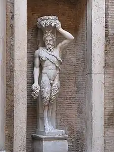 La statue du Marforio est entourée de statues antiques ; deux niches rectangulaires encadrées de travertin ont accueilli, après diverses retouches, les deux statues de satyres portant une corbeille de fruits sur la tête. Les deux sculptures ont été trouvées à Rome près du Théâtre de Pompée et conservées pendant une longue période non loin du lieu de la découverte, dans la cour du Palazzo della Valle (sans surprise elles sont appelées Satyre della Valle). Il s'agit de deux statues en miroir représentant le dieu Pan, le dieu grec de la vie rurale et de la nature, lié au culte de Dionysos, probablement utilisées comme atlante dans la structure architecturale du théâtre, peut-être à l'intérieur d'un petit portique ou d'une loggia. Le traitement du marbre et le rendu du modelé permettent de les dater de la fin de l'époque hellénistique. Le caractère de cette divinité, mi-homme, mi-bouc, avec une tête barbue et des cornes animales, est également souligné par la peau de panthère qui couvre son dos. Les figures sont deux hauts-reliefs d'où se détachent les bras, l'un élevant sur la tête un panier, l'autre abaissant une grappe de raisin[5].