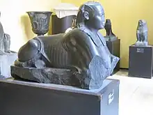La salle des monuments égyptiens est aujourd'hui accessible par la cour ; derrière un grand mur de verre se trouvent les grandes œuvres en granit. Ces reliefs montrent très clairement la grande continuité entre les cultes égyptiens et romains. Parmi les œuvres les plus représentatives figurent un grand récipient en forme de cloche provenant du Canope de la Villa d'Hadrien qui porte sur le corps une décoration faite d'anses avec deux protomés félins. La décoration représente une offrande à la divinité et une ostension de symboles sacrés. Une série d'animaux symbolisant les dieux égyptiens les plus importants : le « Crocodile » en granit rose d'Assouan, provenant du temple d'Isis sur le Champ de Mars (Rome), incarnait la divinité Sobek, l'une des plus importantes du néolithique du Fayoum ; les deux statues en granit gris des « Cynocéphales », également retrouvées dans le temple d'Isis, représentent l'incarnation du dieu lunaire Thot, assis sur ses pattes postérieures avec les pattes antérieures posées sur les genoux. Le sphinx en basanite qui repose sur une plinthe rectangulaire, représenté au repos avec les pattes de devant étendues et la tête alignée par rapport au corps, est considéré comme appartenant à une classe figurative d'époque ptolémaïque, ce qui correspond à la première époque impériale romaine[8].