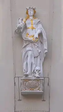 Une porte voûtée en ogive mène à la cour intérieure de trois étages, qui est ornée d'une arcade Renaissance. Les arcades du côté Ouest (colonnes avec chapiteaux changeants) ont été construites vers 1580, les arcades du côté Nord sont de 1979-1980. Sur une console richement profilée, il y a une baie d'horloge de 1380-1390. On aperçoit un couple d'amoureux au pied de la baie vitrée (un homme barbu s'agenouille devant une fille à la forte poitrine, qu'il tient par la main et dont il caresse les cheveux). Sous la baie de l'horloge on remarque une figure féminine en bois sculpté grandeur nature datant de 1650 environ, évoquant une vanitas. L'inscription se trouve sur le cartouche de base : « L'horloge maintenant / est épuisée / souviens-toi qu'il est temps / de mourir. »