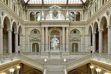 Le bâtiment est remarquable pour son hall d'entrée. Celui-ci mesure 23 mètres de haut pour 15 mètres de large et est surmonté d'une coupole en verre. À son centre trône une statue en marbre de Emanuel Pendl qui représente Justice, armée d'une épée dorée et d'un livre de droit. Au-dessus de la statue se trouve le blason de l'empire d'Autriche.