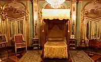 La chambre du roi a été décrite comme l'une des pièces les plus « fantastiques » du palais[8]. De forme carrée, elle donne l'illusion d'être circulaire, avec un plafond en forme de dôme, soutenu par des colonnes portant des miroirs. Entre les colonnes se trouvent des cartouches dans lesquels sont peintes des scènes tirées de Don Quichote.