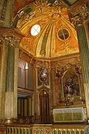 La chapelle, sous son clocher à bulbe, est sombre et possède un style « caverneux ». Elle est décorée de bois taillé et doré dont les détails sont mis en évidence par le rouge, le vert, le bleu et le rose, par le sculpteur portugais Silvestre Faria Lobo[19]. Le niveau supérieur possède des galeries à l'usage des personnalités royales qui s'asseyaient à part.