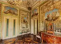 L'ornement rococo en or moulu prend la forme d'importantes dorures aux murs et au plafond. Celui-ci est d'une telle richesse qu'il a été comparé à l'Amalienburg de François de Cuvilliés au château de Nymphembourg[17]. Les murs et les portes sont ornés de miroirs, le plafond peint est doré et soutenu par des cariatides dorée[19].