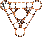 Le plan du palais est un triangle dont chaque côté mesure 40 mètres de longueur. Les coins sont formés par des tours surmontées d'une lanterne à dôme hémisphérique. Les pièces du palais sont situées sur le périmètre du triangle formé. À l'intérieur du triangle est inscrit un cercle. C'est dans ce cercle que se trouve la salle d'apparat du premier étage. Les murs extérieurs dominent de leur masse l'ensemble de la silhouette et forment une espèce de couronne crénelée. À l'origine le rez-de-chaussée présentait des murs de style bugnato, leur partie supérieure étant formée au premier étage d'un appareillage nu. Le volume massif du palais, dont les façades sont entrecoupées de fenêtres à lancettes aux deux niveaux, devait être associée à l'image sévère de l'époque des chevaliers.