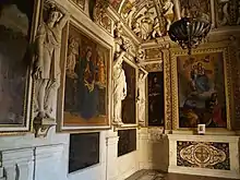 Dès la seconde décennie du XVIe siècle, des statues de papes sont installées dans la salle, signe évident de la reconnaissance de l'autorité pontificale. Certaines d'entre elles ont été depuis déplacées. Y demeurent la statue honoraire du pape Urbain VIII Barberini en marbre, réalisée par Le Bernin et ses assistants entre 1635 et 1640, et la statue honoraire du pape Innocent X coulée en bronze entre 1646 et 1650 par Alessandro Algardi[11].