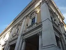Della Porta termine la façade à son idée : il est l'auteur des chapiteaux et de l'entablement du grand ordre des pilastres[5] ; il perce la fenêtre protobaroque centrale, sans doute prévue pour être de même taille que les autres, et place au-dessus de l'énorme ouverture un fronton triangulaire serré entre les pilastres l'encadrant[8], rompant ainsi la régularité des travées, ce qui était contraire aux intentions de Michel-Ange[5].