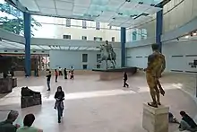 La grande salle lumineuse accueille la statue équestre de Marc Aurèle après les travaux de restauration de cette œuvre, terminés dans les années 1990. Les techniciens ont en effet fortement déconseillé de l'exposer en plein air, à son emplacement précédent, pour en garantir la conservation. Il a donc été décidé de laisser une copie parfaite de la statue au centre de la place, déjà positionnée depuis des années, et de garder l'original à l'intérieur. Marc Aurèle, symbole capitolin par excellence, est le pivot de la nouvelle exposition autour duquel gravitent les objets archéologiques les plus représentatifs de l'ancien Capitole et certaines grandes statues en bronze formant le noyau primordial des collections d'antiquités capitolines[44].