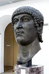Le fragments de cette statue représentant le premier empereur chrétien, la tête, la main et le globe, faisaient partie au Moyen Age, du patrimoine du palais épiscopal du Latran, et parvinrent au Capitole avec la donation de Sixte IV au peuple romain, en 1471. Chef-d'œuvre de l'art du bronze de l'Antiquité, cette grande tête, qui impressionne tant par ses dimensions colossales que par l’intensité de ses traits, a pu être rapprochée de portraits de la fin de la vie de Constantin Ier (empereur romain). A la statue, la tradition attribue la main servant à soutenir le globe, comme symbole du pouvoir sur le mode[46].