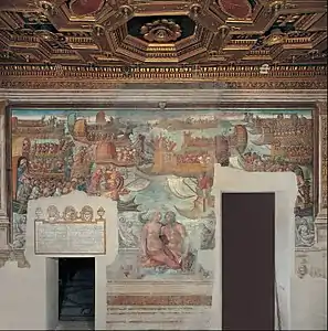 En 1595, le Cavalier d'Arpin reçoit commande d'un nouveau cycle de fresques en remplacement du précédent, détruit au cours des travaux. Le peintre y travaille avec les membres de son atelier et conçoit le cycle comme une série de tapisseries déployées sur les murs : sur les côtés courts, une lourde tenture rouge, retenue par des atlantes, retombe sur les scènes ; sur les côtés longs, les différents épisodes sont séparés par des bandeaux verticaux décorés par des festons de fleurs et de fruits, de trophées d'armes et de vases lustraux ; à la base, une frise en faux marbre est scandée de médaillons monochromes illustrant des épisodes de l'histoire romaine en rapport avec le thème de la fresque peinte au-dessus[11].