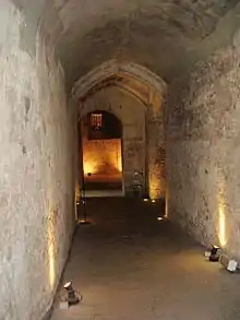 Dans le prolongement de l’Aula Magna, on aperçoit la chapelle de Charles Quint, réputée pour la beauté de ses proportions. Constituée d’une nef unique éclairée par deux étages de fenêtres, elle était construite sur la pente de la colline du Coperbeek, aujourd’hui nivelée. Pour mettre le niveau de culte au niveau de la salle d’apparat, il a été nécessaire de construire un double niveau de soubassements avec de puissants piliers (octogonaux au "-2" et ronds au "-1") destinés à soutenir les poussées de ceux de la chapelle. Derrière la salle et la chapelle, la rue Isabelle permettait de descendre la colline en longeant les jardins et la première enceinte, allant de la place des Bailles en direction de la collégiale Saints-Michel-et-Gudule.