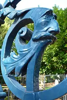 Un discret décor de ferronnerie sur les grilles du parc du Palais du Rhin caricature l’Empereur Guillaume II de Hohenzollern.