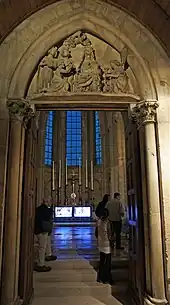 - Cette salle doit son nom au gâble appelé Couronnement de la Vierge provenant du portail central de la cathédrale. Ce gâble d'une largeur de 8 m et d'une hauteur 5,5 m, exposé ici au-dessus de l'escalier d'honneur, fut déposé en 1948-1949[30]. Cette salle comporte plusieurs tapisseries de la tenture de la Vie de Notre-Dame. Celles-ci ont été données en 1530 par Robert de Lenoncourt[31], alors archevêque de Reims. Des sculptures de rois, dont l'une attribuée à la représentation de Philippe Auguste, encadrent les tapisseries.