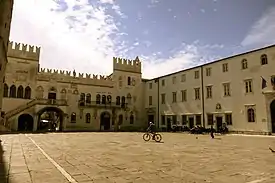 La façade principale a pris sa forme actuelle en 1664, lorsqu'une rénovation en profondeur a réorganisé les nombreuses plaques et armoiries qui y figuraient. Des ornements et une signalisation supplémentaires sont fixés dans le mur de la rue des cordonniers du palais, témoignant de son statut à l'époque où il servait de siège de la ville podestà (une autorité civile et militaire conjointe), de la capitainerie et du Grand Conseil (une assemblée de la noblesse de la ville).
