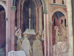 La fresque de la « Crucifixion » au-dessus de l'autel montre également l'archevêque Jacques de Voragine avec son livre de la Légende dorée dans la main. Cette fresque est flanquée de trois fresques de saints, l'un d'eux est le bienheureux Paoluccio Trinci, décédé en septembre 1390 ainsi que Saint François recevant les stigmates.
