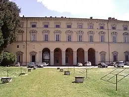 La façade arrière donne sur les vestiges d'un jardin à l'italienne qui comportait à l'origine des grottes et des stalactites, sur le côté un bosquet de chênes et lauriers est délimité par une série de bâtiments annexes parmi lesquels l'ancienne église Madonna della Neve datant du XVIe et rénovée au XVIIe siècle, ainsi que des anciens murs des fortifications, du projet architectural du nymphée à niches avec quatorze statues en terre cuite représentant les Vertus, de style renaissance tardif, datant des années 1630. L'ensemble est complété par la « Palazzina Vitelli ».