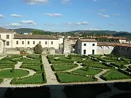 La façade principale, décorée à graffiti entre 1532 et 1535 par Cristofano Gherardi, dit « Doceno » d'après un dessin de Giorgio Vasari, donne sur un jardin qui au XVIe siècle était fameux dans toute l'Europe par sa collection de plantes exotiques.