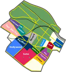 Palermo est un barrio très étendu, avec des secteurs bien différenciés[6]. Il est à noter que les zones présentées ci-dessous n'ont pas d'existence légale, et ne font pas partie de la liste officielle des 48 quartiers qui divisent la ville de Buenos Aires. Ces "sous-quartiers" n'en existent pas moins depuis plusieurs décennies pour certains, quelques années pour d'autres, la plupart du temps selon des critères immobiliers.