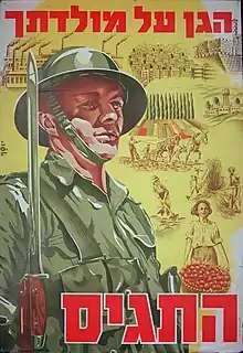 Les Palestine Regiments, comportant des bataillons juifs et arabes, participent au sein des troupes britanniques aux combats en Europe méditerranéenne[42] comme à ceux du Moyen-Orient. Le gouvernement britannique refuse initialement la proposition de l’Organisation sioniste mondiale de constituer une force armée juive clairement identifiée en tant que telle[42] mais accepte finalement la création de la Brigade juive à l’automne 1944[42].