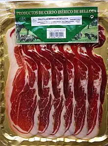 - une charcuterie espagnole. La paleta (ou plutôt paletilla pour les puristes) est une patte antérieure de porc salée et séchée. La patte postérieure donne le jambon et ne doit pas être confondue avec la paletilla, qui n'est que la patte antérieure.
