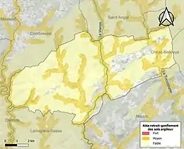 Le retrait-gonflement des sols argileux est susceptible d'engendrer des dommages importants aux bâtiments en cas d’alternance de périodes de sécheresse et de pluie. 30,2 % de la superficie communale est en aléa moyen ou fort (26,8 % au niveau départemental et 48,5 % au niveau national). Sur les 202 bâtiments dénombrés sur la commune en 2019, 7 sont en aléa moyen ou fort, soit 3 %, à comparer aux 36 % au niveau départemental et 54 % au niveau national. Une cartographie de l'exposition du territoire national au retrait gonflement des sols argileux est disponible sur le site du BRGM[18],[Carte 2].