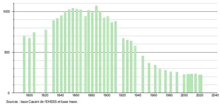 L'évolution du nombre d'habitants est connue à travers les recensements de la population effectués dans la commune depuis 1793. Pour les communes de moins de 10 000 habitants, une enquête de recensement portant sur toute la population est réalisée tous les cinq ans, les populations légales des années intermédiaires étant quant à elles estimées par interpolation ou extrapolation[26]. Pour la commune, le premier recensement exhaustif entrant dans le cadre du nouveau dispositif a été réalisé en 2004[27].