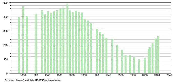 L'évolution du nombre d'habitants est connue à travers les recensements de la population effectués dans la commune depuis 1793. Pour les communes de moins de 10 000 habitants, une enquête de recensement portant sur toute la population est réalisée tous les cinq ans, les populations légales des années intermédiaires étant quant à elles estimées par interpolation ou extrapolation[16]. Pour la commune, le premier recensement exhaustif entrant dans le cadre du nouveau dispositif a été réalisé en 2007[17].