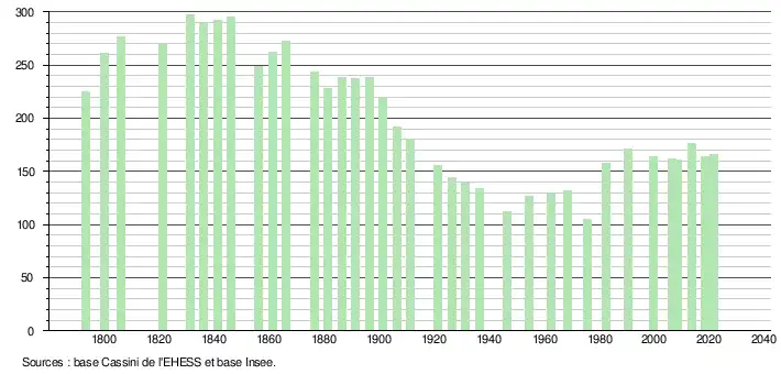 L'évolution du nombre d'habitants est connue à travers les recensements de la population effectués dans la commune depuis 1793. Pour les communes de moins de 10 000 habitants, une enquête de recensement portant sur toute la population est réalisée tous les cinq ans, les populations légales des années intermédiaires étant quant à elles estimées par interpolation ou extrapolation[18]. Pour la commune, le premier recensement exhaustif entrant dans le cadre du nouveau dispositif a été réalisé en 2008[19].